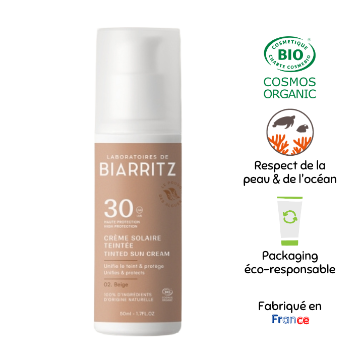 La Crème solaire teintée SPF 30 certifiée bio assure une triple fonction : haute protection solaire, hydratation optimale et perfecteur de peau.